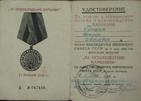 Награжден орденами: Отечественной войны 2 степ. и Красной звезды, медалью «За освобождение Варшавы»,  «За Победу над Германией».