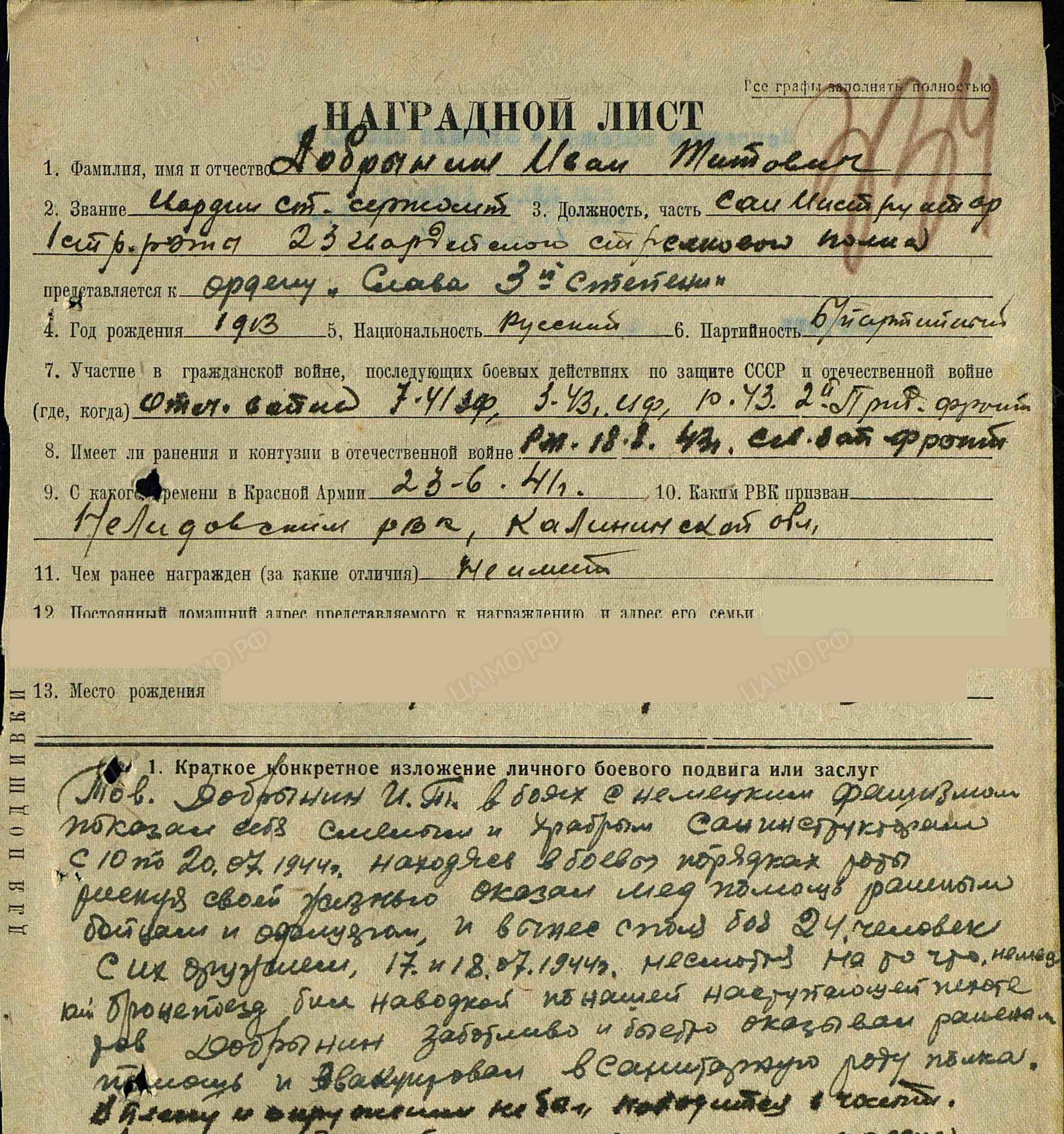 Родился в 1913 г. в деревне Моисеевщина. Как и все люди, с тревогой слушал я в 41-ом выступление Молотова по радио. 23 июня уже был призван в действующую армию.